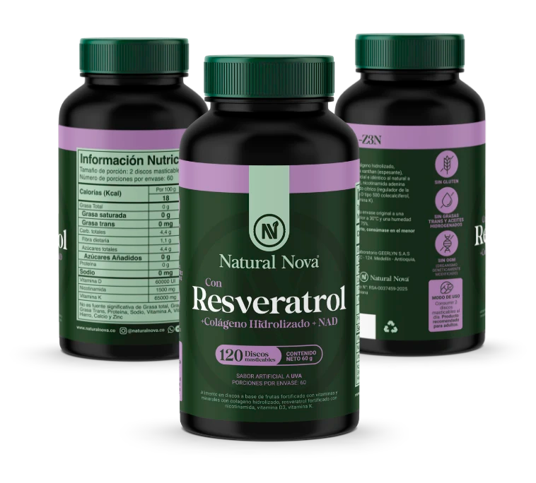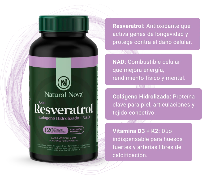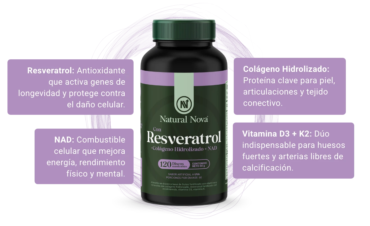Resveratrol, NAD y Colágeno Hidrolizado, potenciados con D3 y K2, para que tu energía, tu piel y tu mente trabajen como cuando tenías más tiempo por delante.